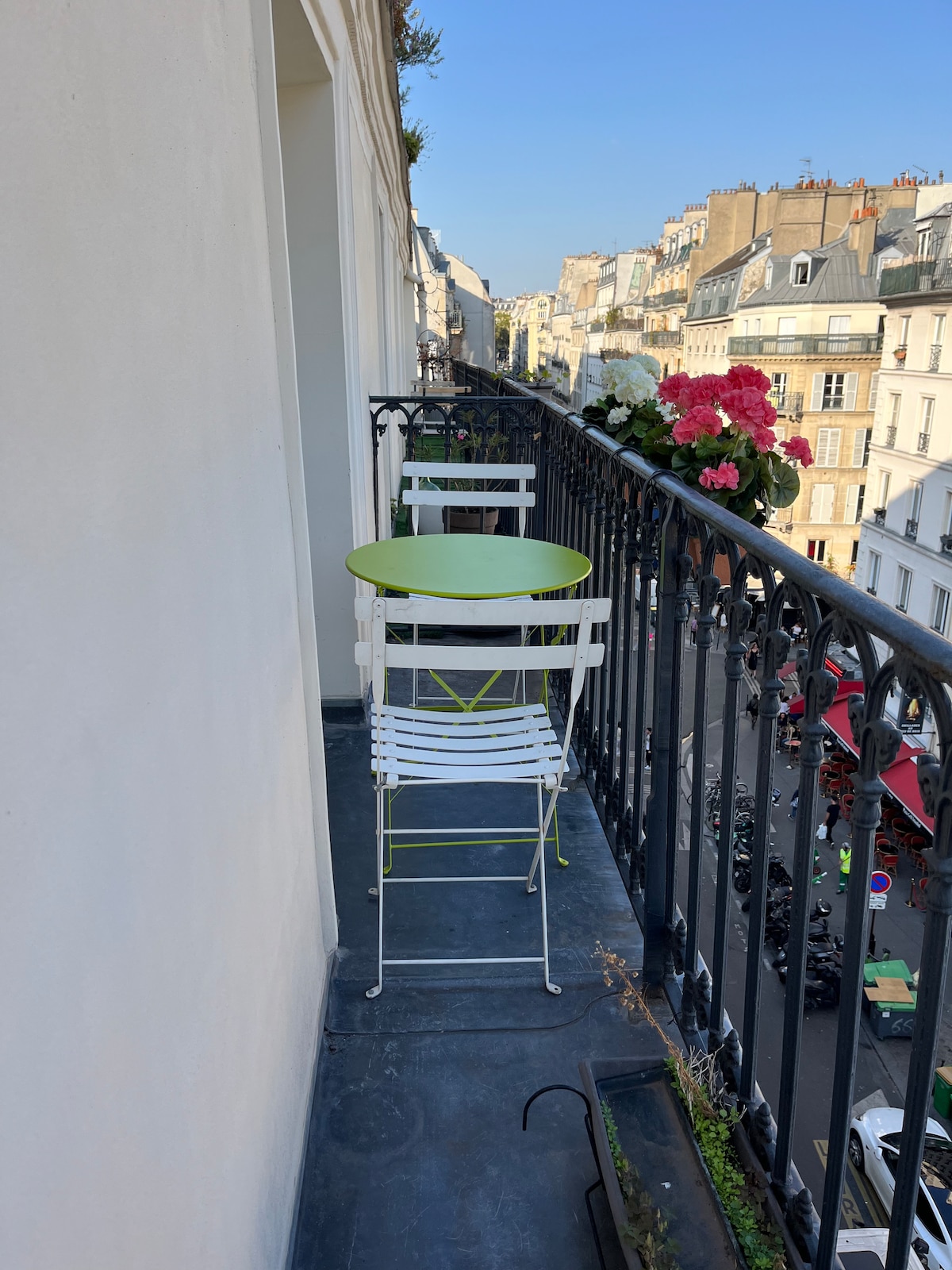 The modern, well-lit and recently renovated apartment is on the last floor of a charming apartment building with an elevator. Situated on a quiet street, it is in the hip Rue des Martyrs area, with a lively local presence and many cafés, bars and restaurants. It is only a short walk to Montmatre, the Moulin Rouge and Opera, and 3 metro lines (2,7,12). There is a magnificent view from the living room balcony over the roofs of Paris and the Eiffel tower. Well equiped kitchen and high-speed wifi.