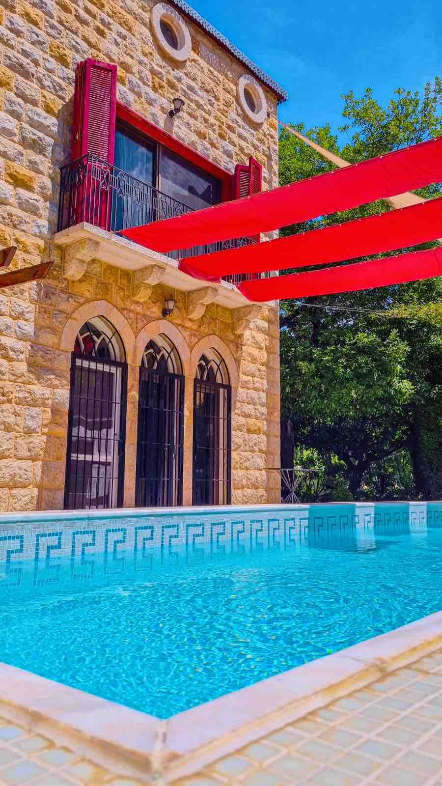 Elegant tradition/modern living Solar system for water Photovoltaic for electricity+ 10A Generator A welcoming friendly concierge with his living amenities Two car parkings Stone stairs with tilted fig tree Terraces and lawn furnished with comfy furniture Traditional Lebanese house architecture with modern living One open space with 2sides fireplace Bright fully equipped kitchen with easy access to BBQ/Pizza oven and gas cooker Solar lights mini fountain Bedrooms with ensuite bathrooms