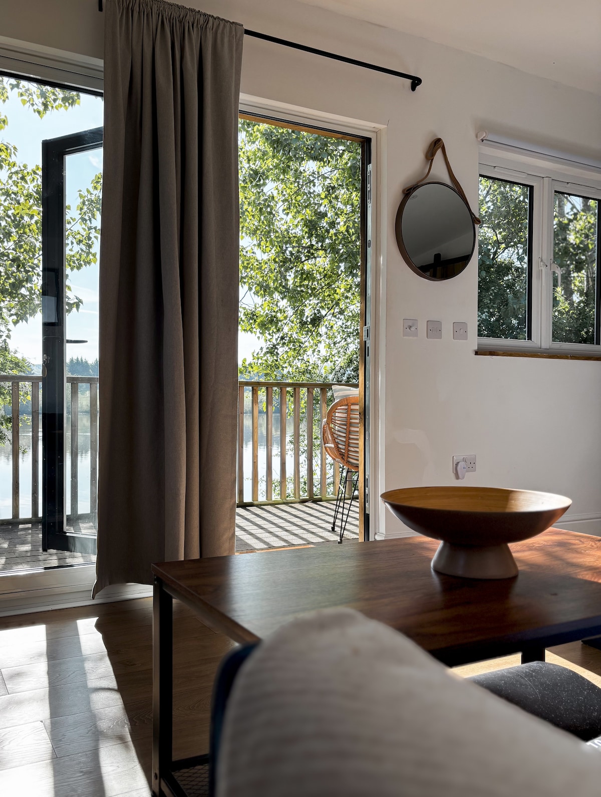 A private lakeside lodge with its own hot tub. A two-person, interior-designed studio space situated on edge of private lake. Hot tub, deck with Outdoor furniture, lounge area, a fully functional kitchen, shower, and a bedroom area with a handmade double bed and clothes rail, as well as all the modern cons. Wild swimming, paddle sports & SUP all available to guests, at an additional cost. Please note there is intentionally no TV or WIFI in the hope you can switch off from the rat race!!