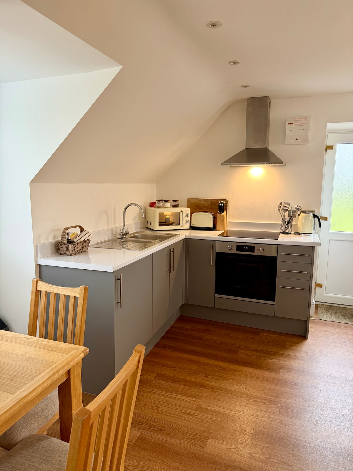 Nestled in the peaceful village of Scorton, within the breathtaking Forest of Bowland AONB, lies The Orchard at Snowhill Glamping. This charming self-catered retreat offers access to a private hot tub (optional extra) and provides the perfect base for exploring Lancashire’s rolling countryside, scenic trails, and local attractions. Ascend the staircase to discover a bright, open-plan living space complete with a fully equipped kitchen featuring all the modern appliances and essentials.