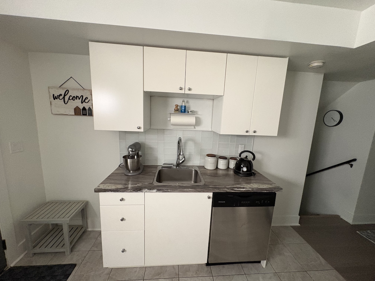 Welcome to our cozy ground floor suite with a green garden view and lots of natural light. Enjoy a private entrance and self-contained space with your own outdoor space in our peaceful and enclosed backyard. The suite was renovated in 2024 with a small but full kitchen including a full sized oven and microwave. The back of the house is South facing so you can enjoy the afternoon sun. The suite has one bedroom with a queen sized bed and wardrobe, a futon, and a washer and dryer in the bathroom.
