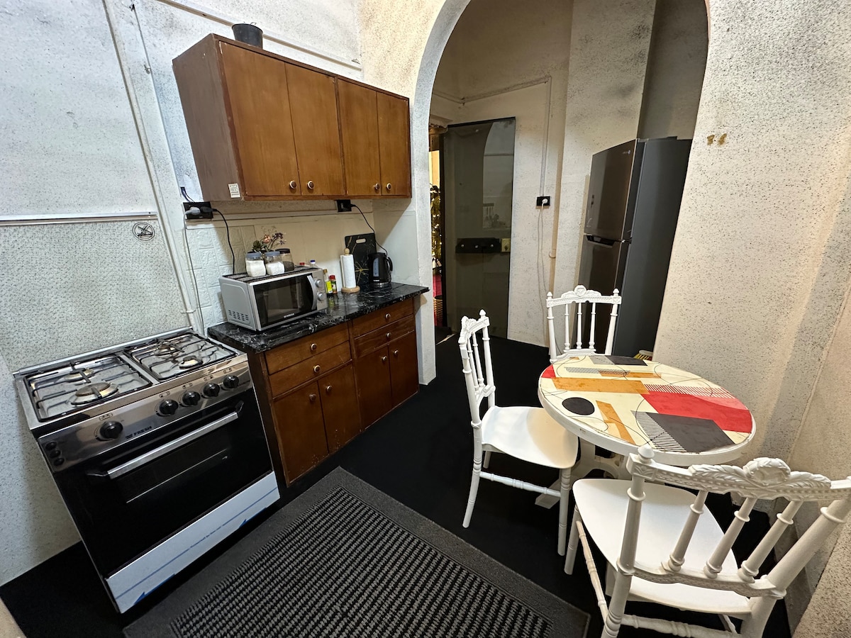 Historical,Nostalgic & Brilliant appartement located in the heart of down town of cairo . A large,comfortable living room with a 48 Inch smart TV,Wifi,Coffee corner and a sofa bed that can be opened for one extra person ,enjoying a very sunny view ,Fully loaded kitchen & A cozy bathroom, A well Air-conditioned bedroom features a comfortable queen size bed in addition to a lovely dining table,The unit is completely a brand new & 3 Mints to the Egyptian Museum,Tahrir square & River Nile.