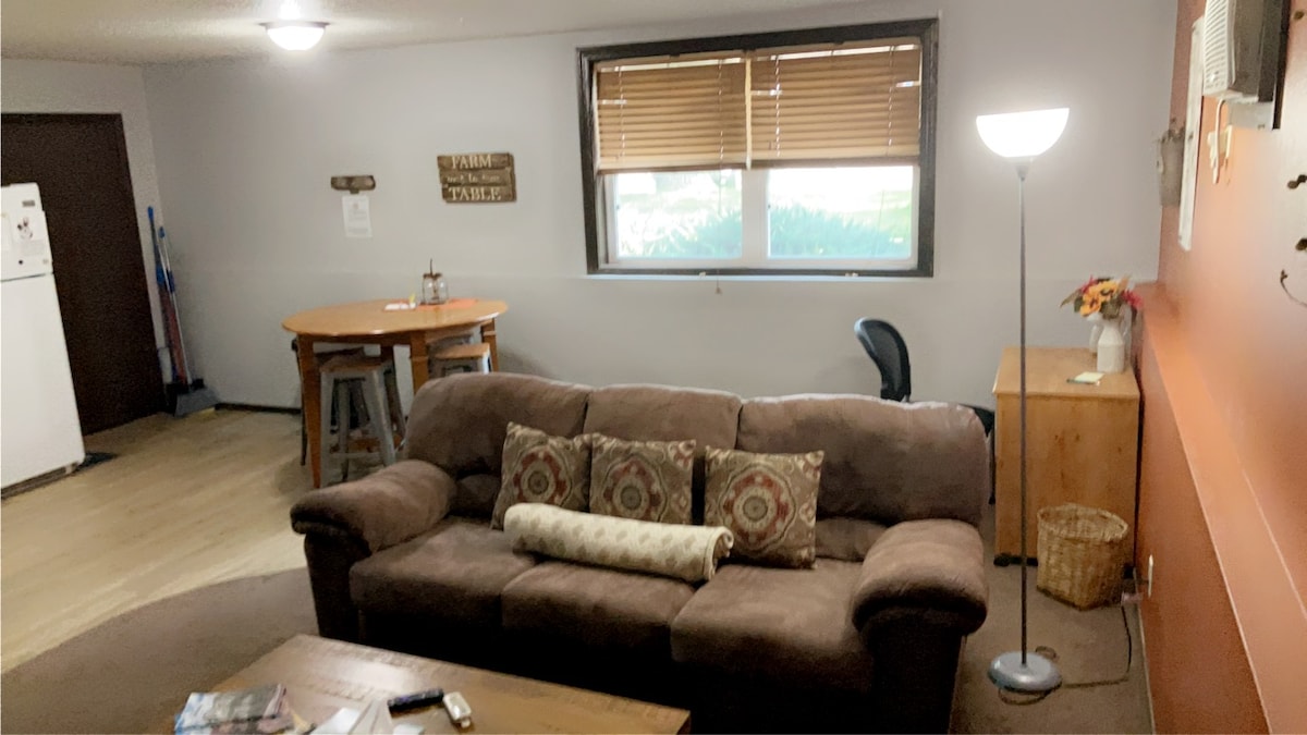 Clean, Sunny and rustic.. feels like a South Dakota Sunset. Spacious, entire apartment with two bedrooms, 1 bath, full kitchen, free Wi-Fi, cozy living room and a cute table with benches to eat, converse or use as an office. Great private, secure parking. Located close to great places and entertainment! Grab your walking shoes and head right out the door to a walking path. Also Close to the shopping mall, theatre and Event Center. Pets are welcome!