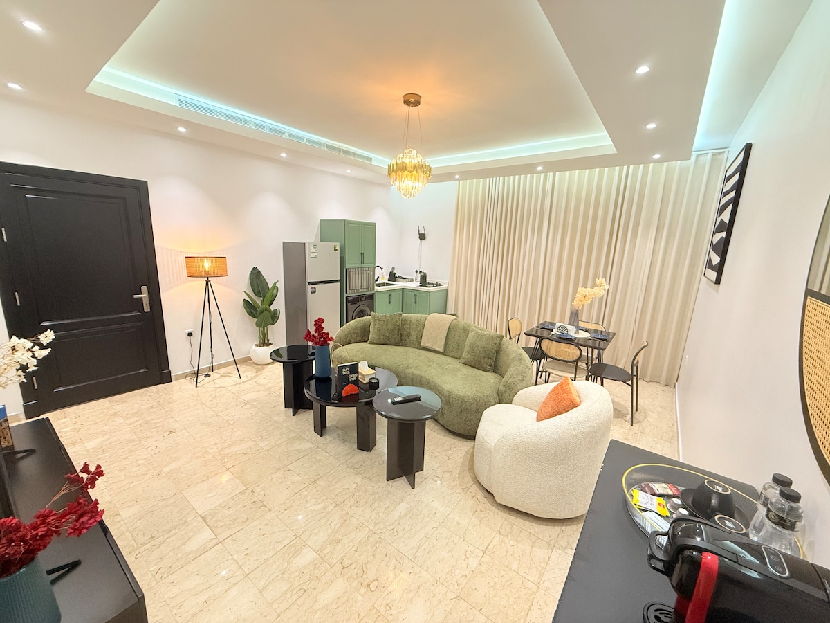 Welcome to our cozy private studio, designed for your comfort. 🚪Enjoy the convenience of Self Check-in with a smart keypad. Enjoy 5G wifi and a 75-inch TV with Netflix, Shahid, and YouTube Premium The bathroom is stocked with essentials like towels, soap, shampoo, and body wash for your convenience. Just a minute away, you'll find everything you need such as a mini-market, laundry service, barber shop, and restaurant.