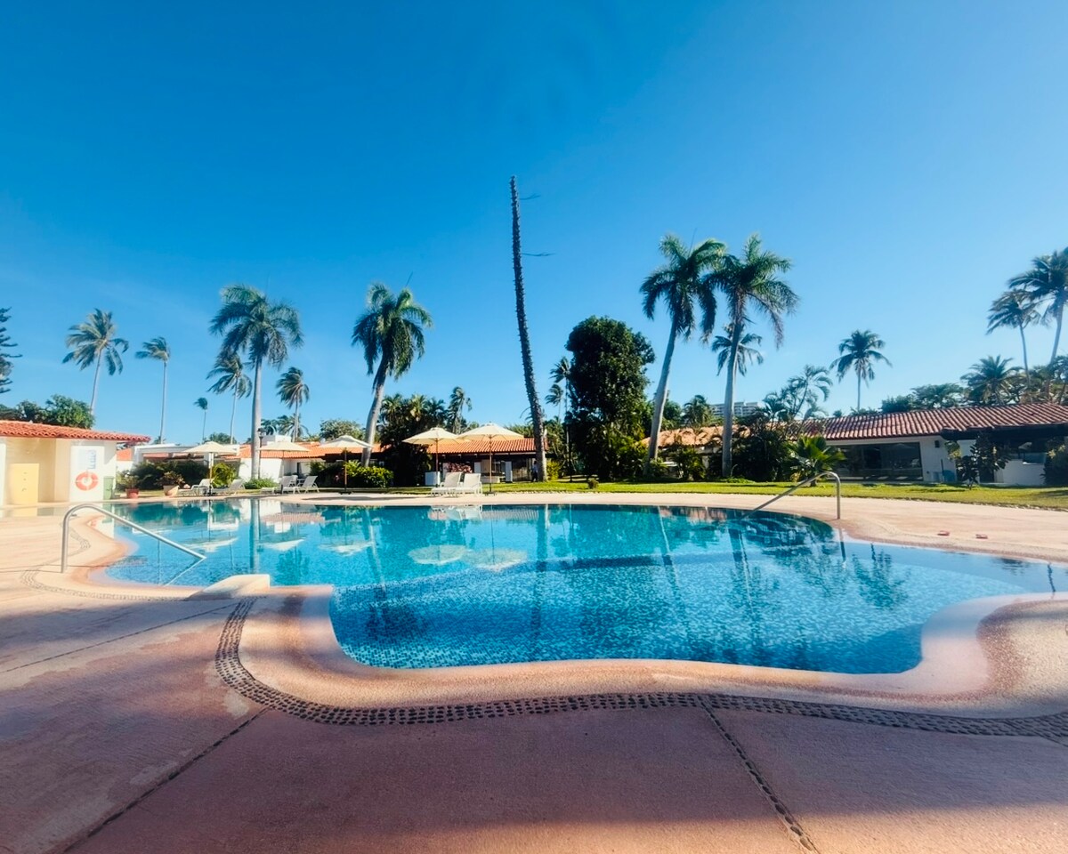 Suite con 2 camas Queen en zona exclusiva de Acapulco Diamante 1 baño completo Closet Cochera para 1 vehículo Sillón Cocineta Refrigerador pequeño Horno microondas NO ESCALERAS jardines Área infantil Alberca común Canchas de tenis, pádel, fútbol Golf ($) Vigilancia A 1 5 min del aeropuerto en auto La mejor opción para descansar Medidas de higiene y sanitización