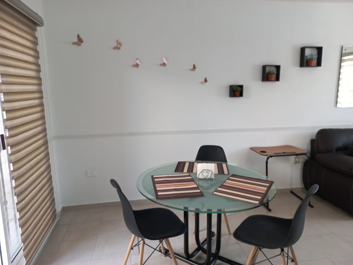 A charming one-bedroom apartment located in the exclusive, private, safe, and quiet Zona Plateada Pachuca. Enjoy a comfortable queen size bed, spacious closet, SmartTv. Equipped with a stove, refrigerator, coffee maker and cooking utensils, dining room for 4 people. Cozy living room with a comfortable sofa. Modern and clean bathroom. Wi-Fi, 24-hour secure parking. A few minutes away from restaurants, shops and tourist attractions. Access to public transportation and the city's main roads.