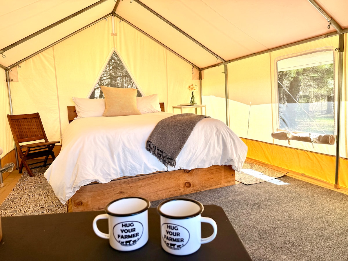 At the edge of a wildflower meadow with mountain views, this beautifully furnished glamping tent has two queen beds, front porch and private rear deck. Each of our four tents has a kitchenette in the Lodge. Sweet new Bath House. Enjoy wood-fired pizza (most but not all nights) and our new all natural wood hot tub (booked for private experience for $25) . 40 acres of meadows, woods, pond, streams and trails. Nightly bonfires and star gazing, a nearby lake and rafting in the Hudson River.