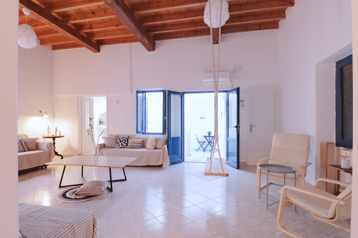 Μέσα στη Χώρα της Ίου, σε κεντρικό αλλά ήσυχο γραφικό σοκάκι, αυτό το σπίτι ξεχωρίζει για τον ατμοσφαιρικό του σχεδιασμό και την κομψή κυκλαδίτικη αισθητική του με τις λευκές καμάρες, την αυλή με θέα στο γαλανόλευκο καμπαναριό, τα φυσικά υλικά και τις μοντέρνες πινελιές συνθέτουν μια μοναδική εμπειρία διαμονής. Ιδανικό για ζευγάρια, οικογένειες και παρέες που αγαπούν την αυθεντικότητα. Η απόλυτη γαλήνη σε συνδυασμό με την ξεχωριστή ενέργεια της Ίου σας προσφέρουν στιγμές αληθινών διακοπών.