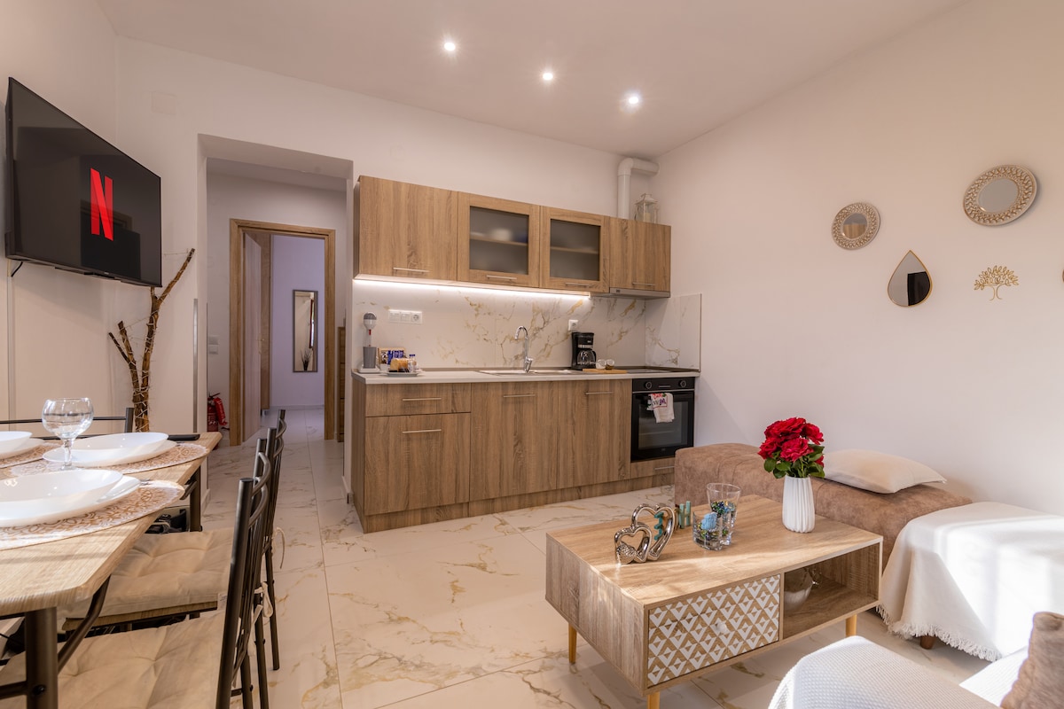 The villa is next to the Chorefto beach. Built with the basic natural materials from the area, stone and wood. The materials used are considered art constructions, perfectly safe for health and give the entire building a natural colour image. My villa is suitable for couples, business travellers and families (with children).
