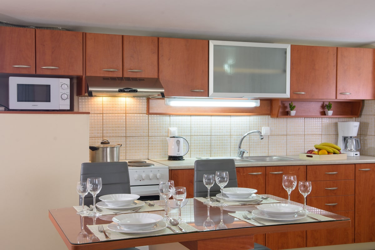 Lucy’s apartment is a newly built apartment, away from the beach with only a short 4 minute walk! Here, you can find a cozy apartment, with all the amenities you need for a cozy and a worries free stay. The living area includes a flat screen TV, a sofa that can be converted to a bed for 2 people and a new cuisine with a fridge and a sitting area. The bedroom has a double bed, night stands with lights and a closet. The bathroom, with the beautiful marble look, contains also a washing machine.