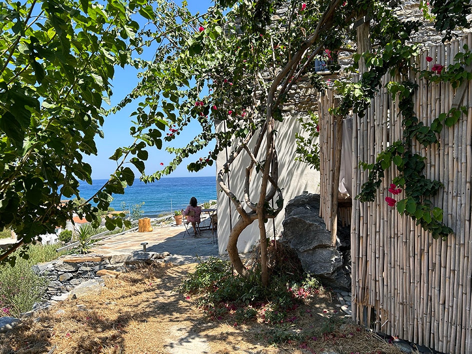 A beautifully renovated 100 year old stone house nestled amongst plane, eucalyptus and olive trees with a unique outdoor stone seating area surrounding an ancient olive press. Wake up to beautiful views of the sea and the mountains in this peaceful setting. An ideal place to decompress and get inspired by the sounds, scents and vibes of nature. Our 6000m2 property is full of olive and fruit trees, organic vegetable gardens, and authentic Ikarian herbs, all for your use.