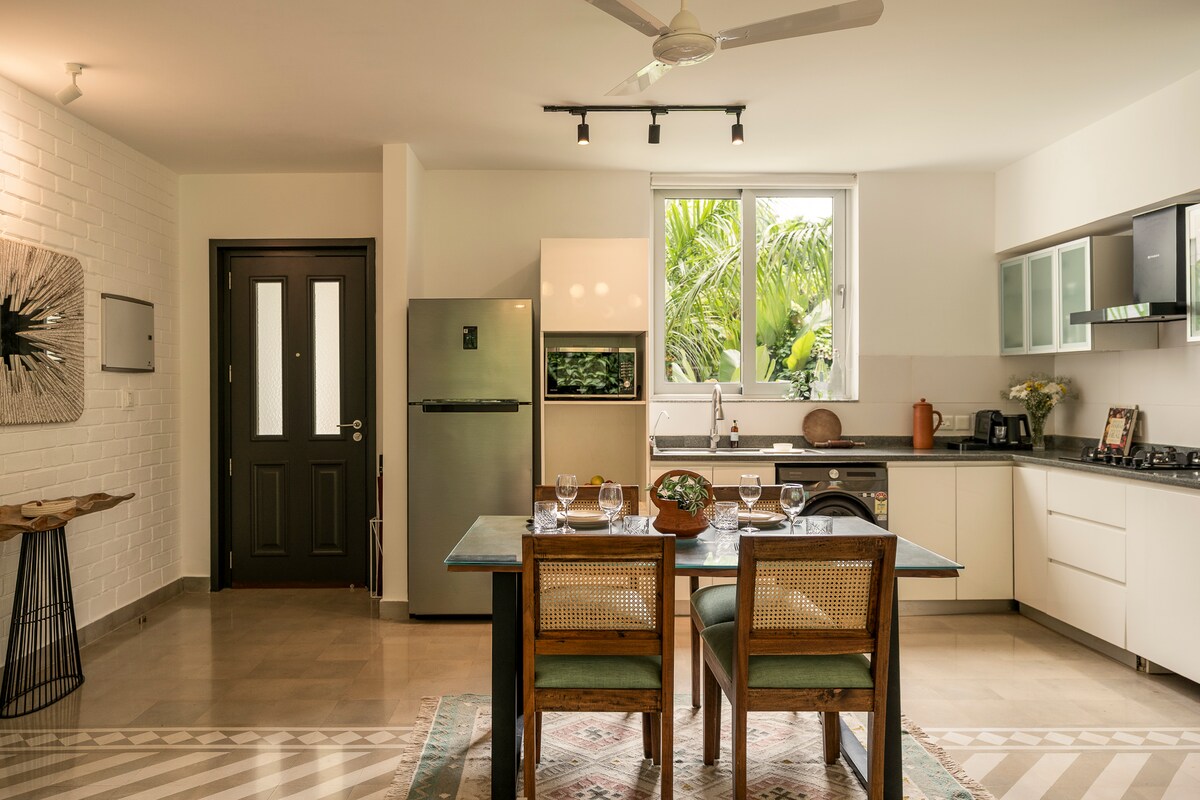 El Rosario 01 by The Blue Kite is a serene 2BHK is located on ground-floor apartment in Nerul with elegant modern interiors, a private garden with a hammock, and access to a common pool within a gated community. It features a spacious living room, a fully equipped kitchen, and two bedrooms with attached washrooms ideal for families or groups of friends. Coco Beach is just a 10-minute drive away, while popular restaurants like The Lazy Goose 10 min, The Burger Factory 6 min.