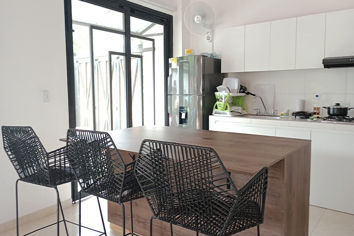 Beautiful house with private pool in a warm climate and surrounded by nature. Just 2.5 hours from Bogotá. It has a capacity for 15 people. 3 bedrooms equipped with bedding sets, 3 bathrooms, a living room with a sofa bed, a fully equipped kitchen, a refrigerator, cable TV, and a barbecue grill. The pool area is equipped with sun loungers, a rocking chair, palm trees for shade, and a large 6 x 10 super warm and family pool. Parking for 5 cars Camping space