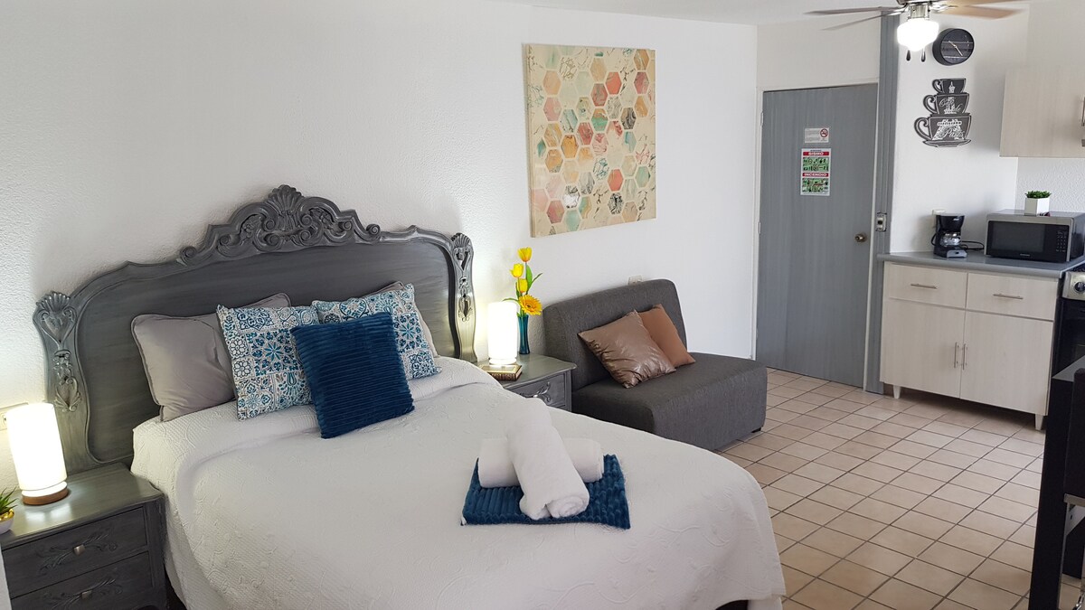 Independent and cozy loft, great location. King bed, cable TV, and magnetic induction stove. A few blocks from Victoria and Deportivo IV Centenario stadiums. Close to the railway complex where the Museum of Contemporary Art, Hospital Hidalgo, Grupo Modelo offices, Telethon and Tres Centurias Railway Complex are located. South/North of the city in 15 minutes and Downtown in 7 minutes. 10 minutes from the Poliforum Charro. Enjoy what Ags has to offer; make yourself at home during your visit.