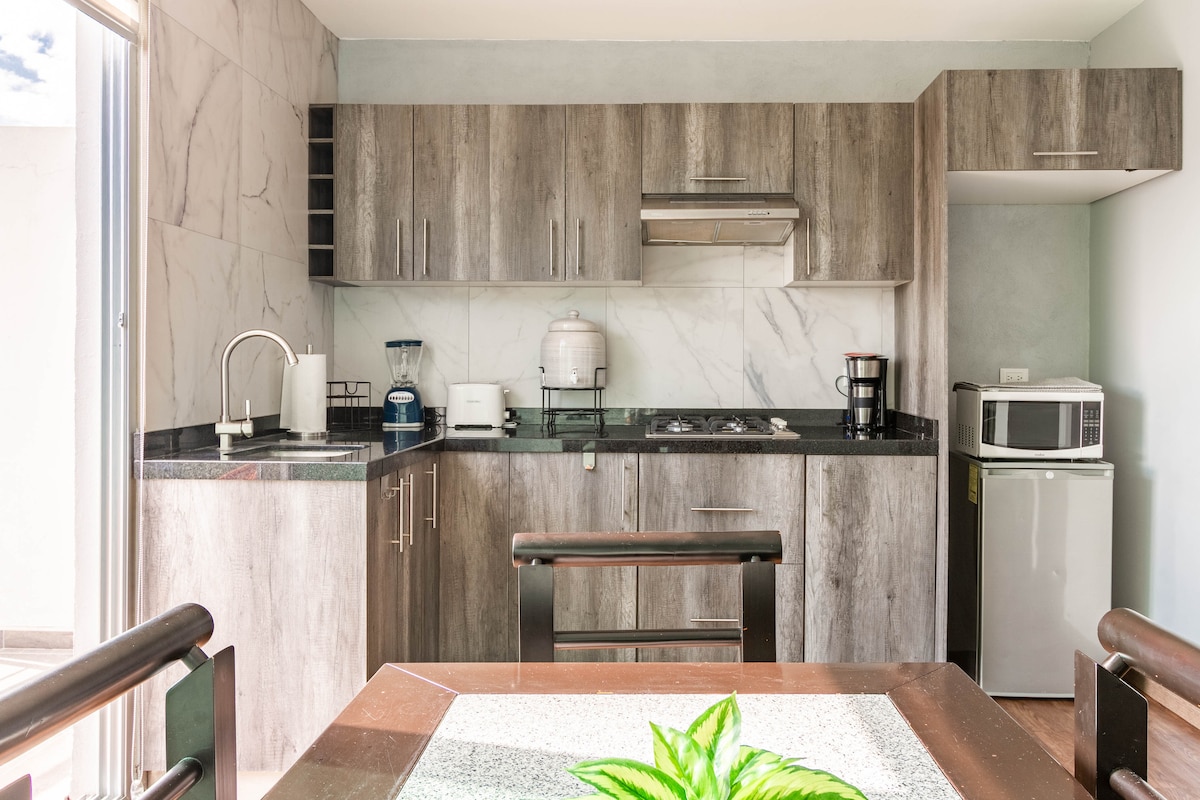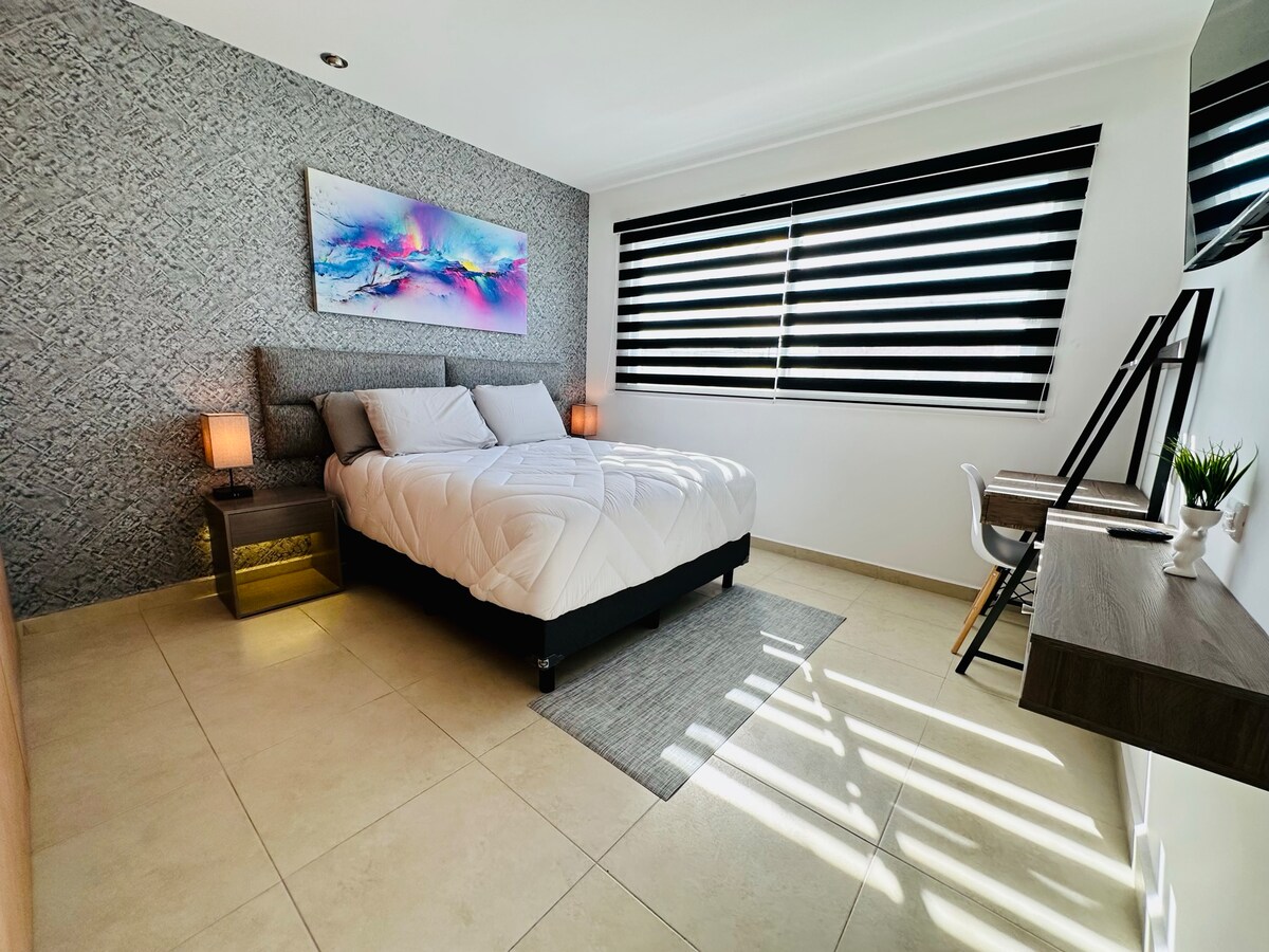 Relax in this amazing, private, safe, and elegant double-height LOFT "A" with an upstairs bedroom, queen-size bed, independent access, perfectly ventilated, and illuminated by natural light. Self check-in with digital keypad lock. It provides free enclosed parking for 1 car with electric gate, full services, new furniture, excellent amenities, A/C, high-speed internet and an interior design that you will love.