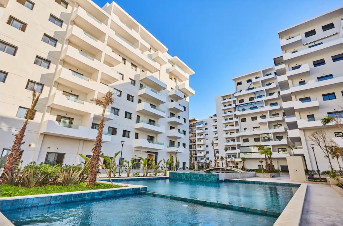 Welcome to this beautifully furnished, bright and spacious one-bedroom apartment located in Zenata Eco-City, Casablanca, just a 3-minute walk from the beach. Key features: - Complimentary parking slot - Beach nearby (across the street) - Pool - Family friendly - Baby crib / high chair - Playground for children nearby - Remote working friendly - Smart lock - Secure and well-maintained building - Wifi - Smart TV - AC / heater - Coffee machine - Well equipped kitchen - Elevator - Interior garden