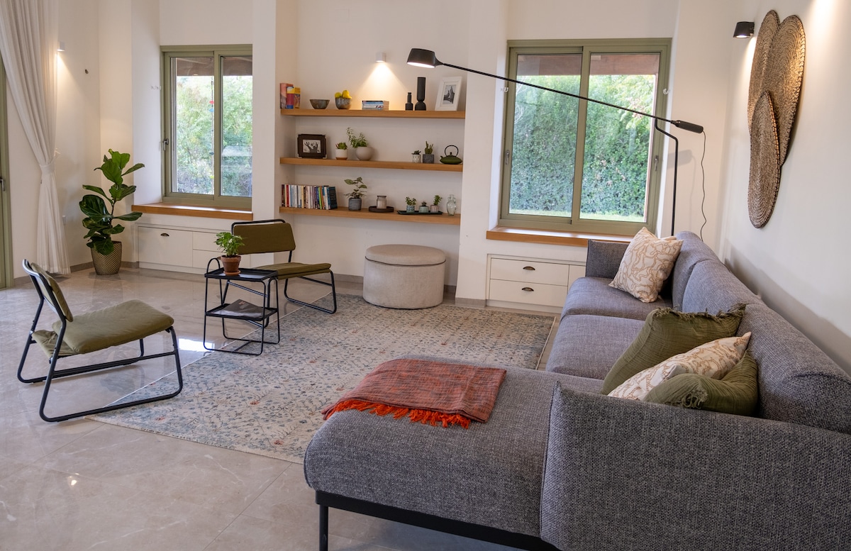 A gorgeous house with a rustic design🦋 Around us are a variety of landscapes and magical springs✨️ (10 to 25 minutes drive/bike/walk) The house includes four spacious, stylish and cozy bedrooms. Two toilets and showers - one with a bathtub. A spacious and comfortable living room, A spacious and well-equipped kitchen with everything you need for a pleasant and fun stay. Our yard is spacious, with well-kept grass, a football goal, a variety of seating areas, swings, and hammocks. There's also a gas barbecue and a taboon. To complete the special experience, we equip our guests with 4 pairs of bicycles with which you can reach quiet and unique corners of the valley