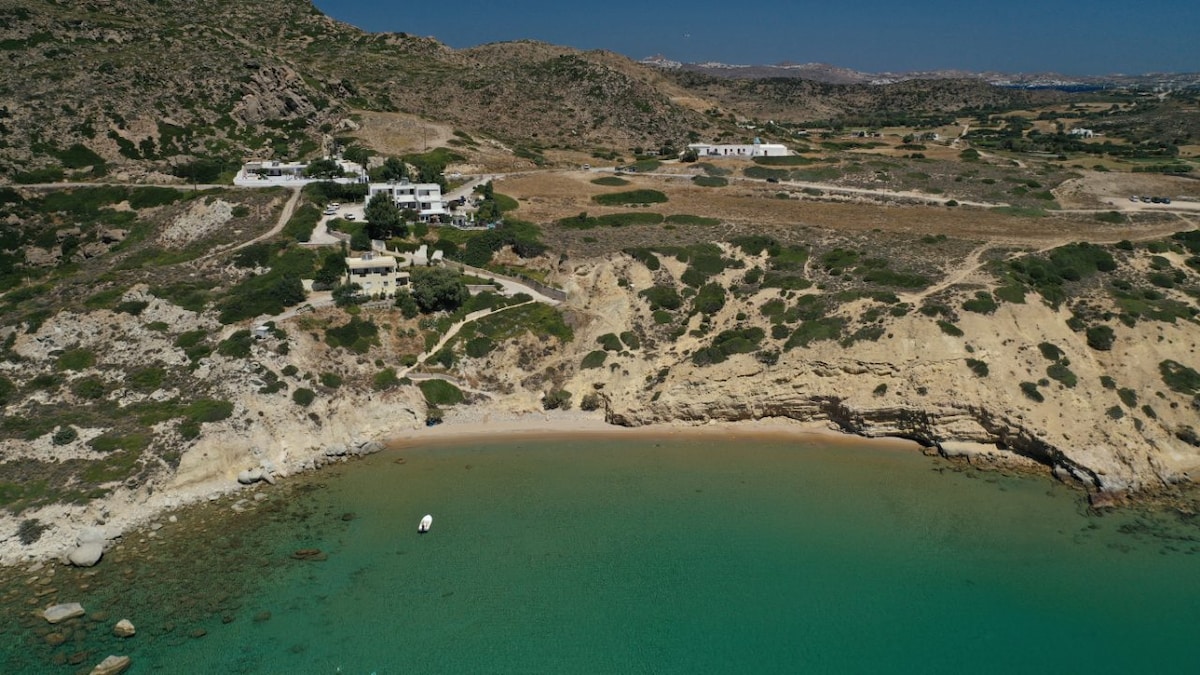Private, high-ceilinged farmhouse apartment with bedroom and bathroom. Special kitchen corner, preparation of breakfast & cold dishes. 2 balconies (40m2 in total), with a panoramic view of the port in front and the sea of Sarakiniko behind (the lunar landscape is only 15 minutes away on foot). Distances: 4 minutes from the port and 7 from the airport by car, Plaka: 5km, Pollonia: 7km, Fyriplaka-Tsigrado in 15 minutes. Recently landscaped garden, natural environment with privacy & tranquility