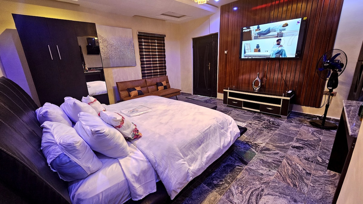 2bed + 24hrs💡 + Netflix + DStv + Ac + fan + 5min👉👈 airport