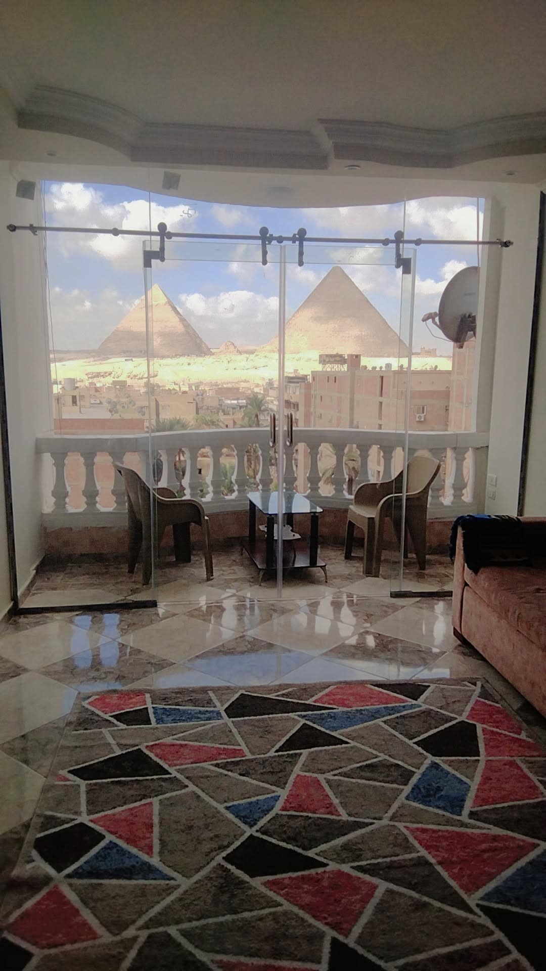 Our apartment is located near the three pyramids and the Sphinx, 10 minutes away. What a wonderful view from the balcony. The apartment is considered a starting point for all your tourist trips.Local market nearby: supermarket, pharmacy, restaurants, tourist bazaars