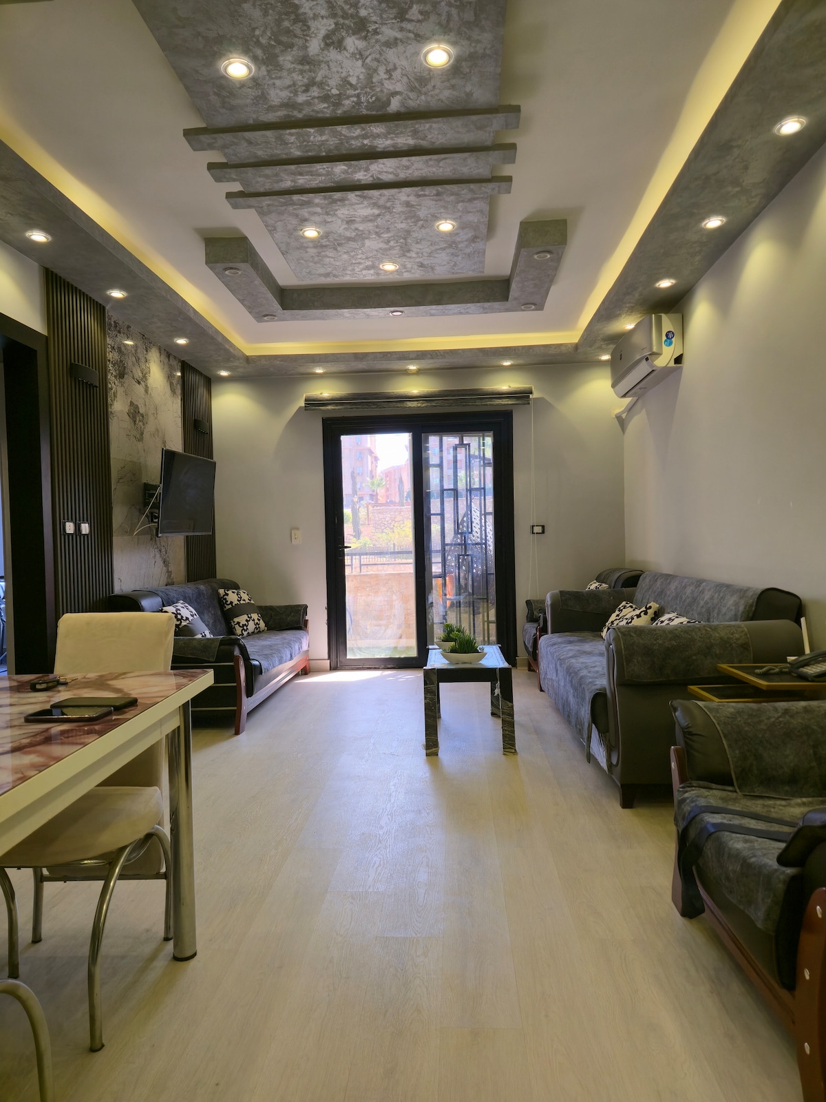 θ Description of the apartment: Living 🛋️ room Luxury hotel experience with a luxurious home touch! Enjoy a sophisticated atmosphere that combines luxury and comfort, where the living room features a modern, elegant design and a carefully spacious space. It includes a comfortable seating area ideal for relaxation, and a PS4 for entertainment. For viewing enthusiasts, you'll enjoy a luxurious 75-inch cinematic OLED TV with stunning picture quality, along with high-speed internet for a complete entertainment experience suitable for short and long stays 🍸 Kitchen: Open to the living room in an elegant style, with luxurious bar chairs that add a refined aesthetic.