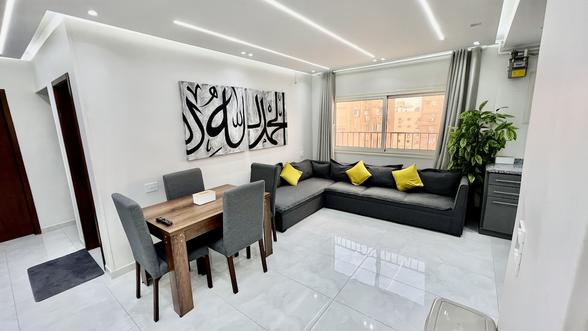 Welcome to lovely Charming Luxury apartment! My Apartment located in Nasr City Enjoy modern elegance 2 Bedroom , complete AC, and comfort. Stylish living area, fully equipped kitchen. You'll love the stylish décor and cozy atmosphere, which makes it the perfect home away from home. *High-speed internet. *10 mins to City Center Almaza & City Stars Mall *15 mins Cairo Festival Mall *15 mins to Airport Book now for a delightful stay!