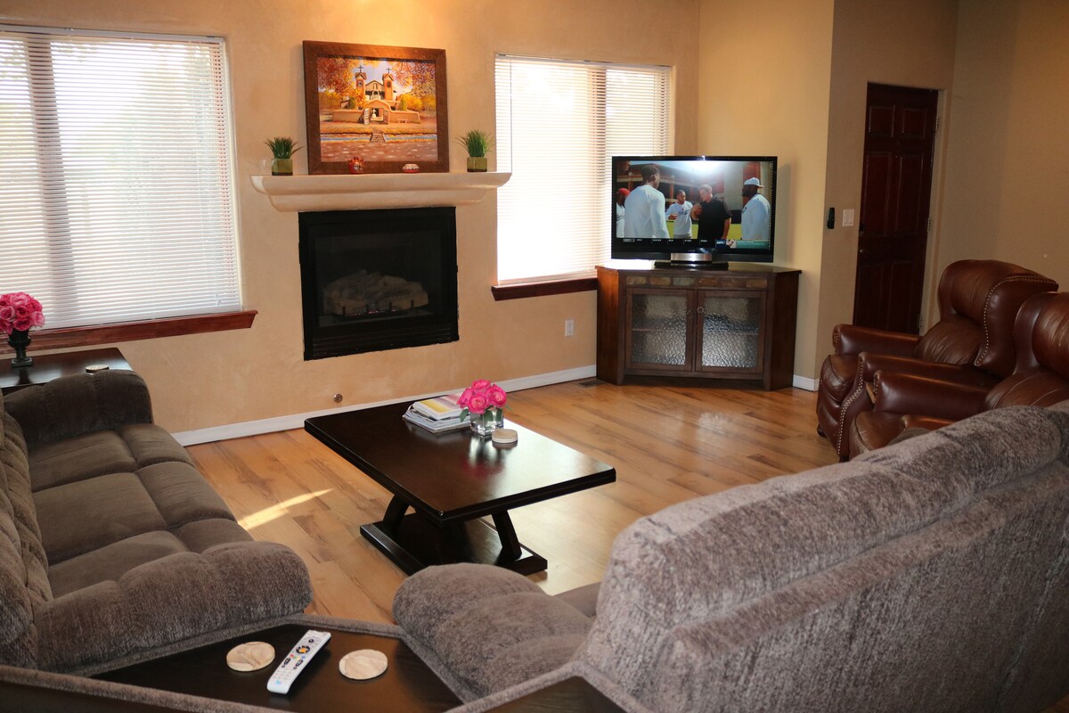 A completely private Southwest guest suite (no kitchen) with amazing views, coffee nook, pool, spa, outdoor fireplace and BBQ all on a completely fenced acre. Your 2 story completely private wing with separate entrance includes 2 bedrooms and full bath downstairs. Upstairs is a large open room with fireplace, sofa bed and large deck with views of ABQ below. A sound proof wall separates the private guest suite from the main house with safe parking inside the fenced property.