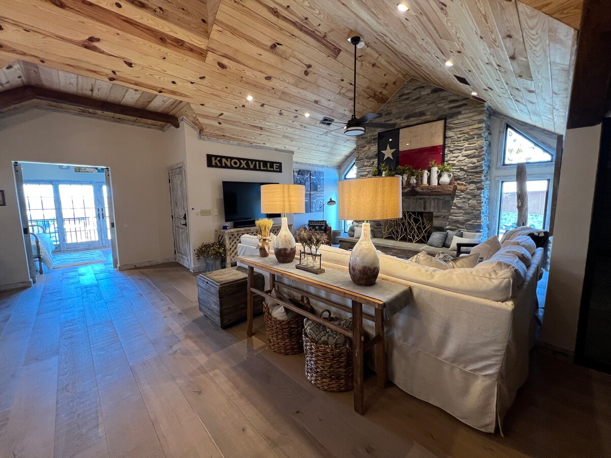Nestled between Knoxville and the Smokies, this modern A-Frame is a dream getaway! Relax in the soaring living room with a massive stone fireplace, or challenge friends in the game room featuring ping pong and boss toss. The fully stocked chef’s kitchen is perfect for home-cooked meals, and the private hot tub is waiting for you after a long day of adventures. Enjoy your morning coffee on the balcony with forest views, then explore Pigeon Forge!