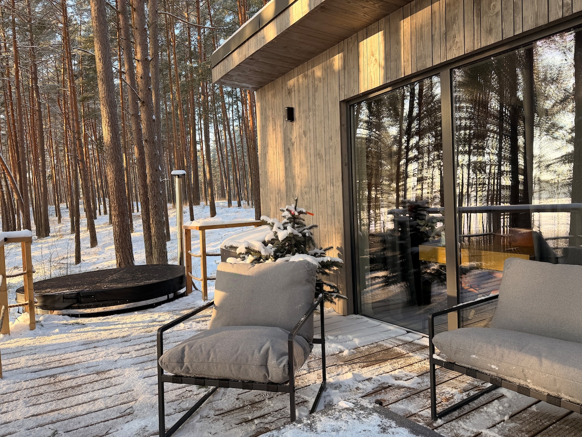 A design-lover’s retreat near Riga. This stylish cabin is next to our plant nursery, with a cozy café just steps away. Surrounded by trees and flowers, it’s the perfect place to disappear for a while. We have robes, slippers, toothbrushes, towels, hair dryer, hair straightener, shampoo, conditioner! Also a free bottle of water, spices, coffee, tea, olive oil, hot chocolate etc! wood-fired hot tub, 60€/per booking (request latest 1 day in advance) For more info: oranzerija.kabriolets