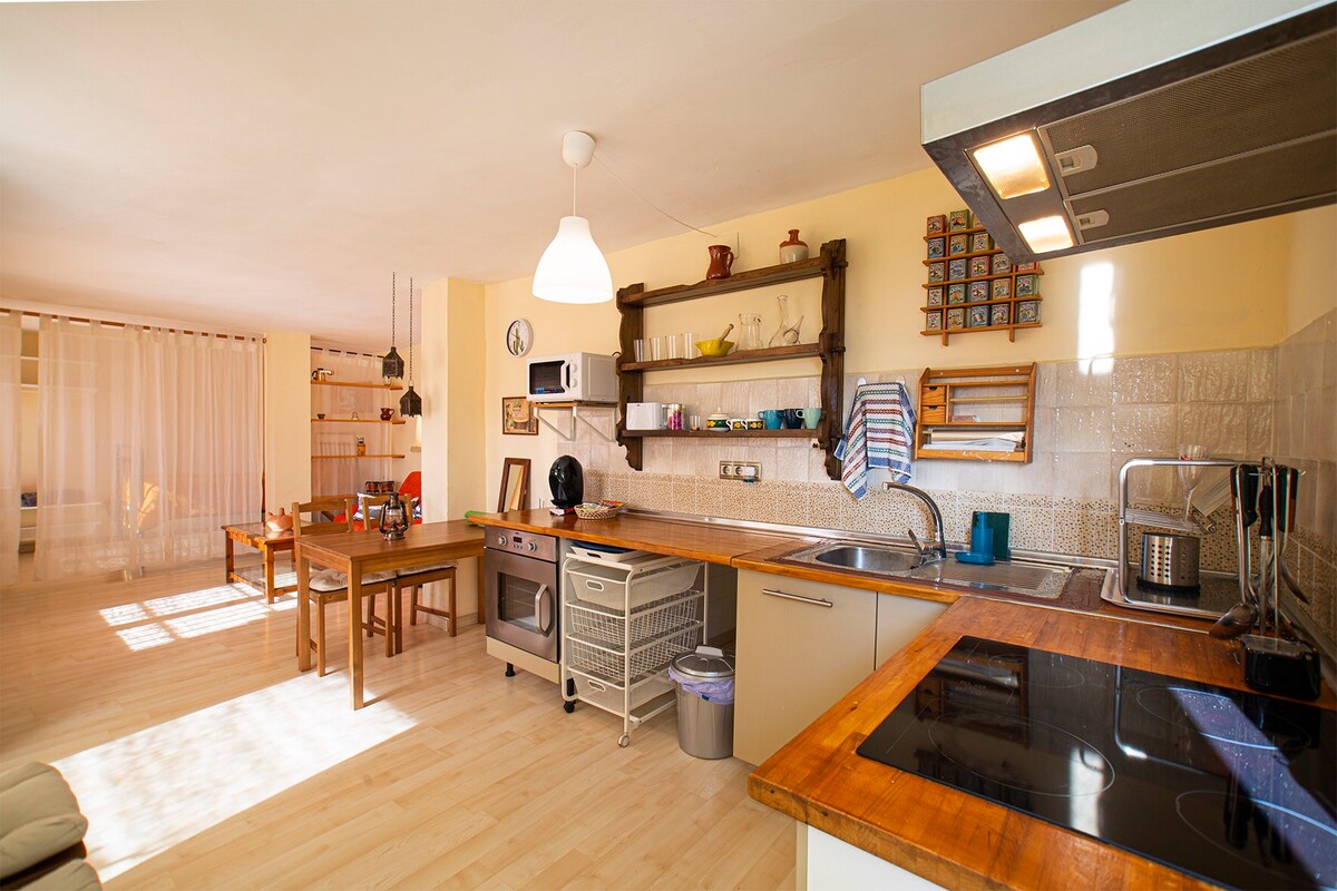 In Cenes de la Vega, an independent apartment with a kitchen, living room, bedroom, bathroom, shower, laundry room, patio, and garage. We are 5 km from the Alhambra and the center of Granada, possibility to go by car or urban bus (every 10min) from Cenes. 30 km from Sierra Nevada ski resort (Pradollano parking) direct exit. 70 km from the beach (45 min drive by highway). In addition, due to its privileged location, you can practice hiking, horseback riding, mountain biking and paragliding.