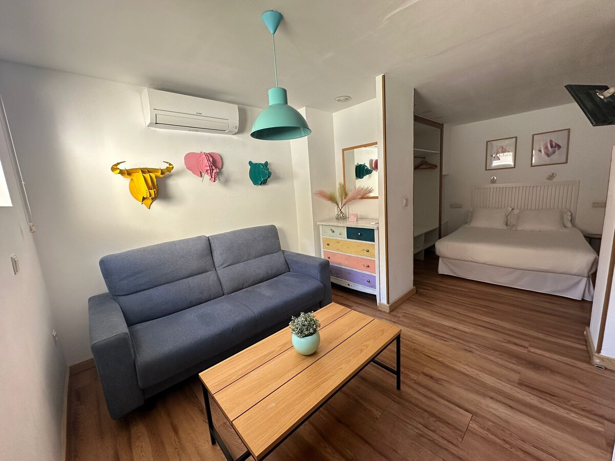 Apartamento recién reformado y totalmente equipado, muy bien situado y luminoso. Ideal para una persona, pareja o pequeña familia. ¡Incluye cochera! Zona céntrica pero tranquila, a 10 minutos a pie de la catedral, fácil acceso en coche y transporte público, con parques y zonas naturales muy cerca. Espacio abierto tipo LOFT con cuarto de baño y pequeña terraza-lavadero (para fumadores). Con cama de 1,50m y sofá-cama de 1,40m, calefacción, aire ac., smart-TV, lavadora, lavaplatos… ¡todo nuevo!