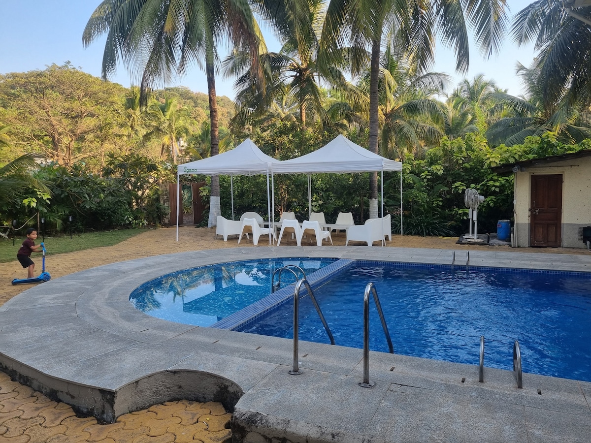 This 3 bedroom is super luxurious and exclusive to its guests. Rooms are AC with fiber optic Wi-Fi . 7 minutes walk from beach with restaurants in walking distance. Running genset and Invertor. Lots of outdoor indoor sports, Trampoline, bikes, TT, Carrom, badminton, music system, Barbeque etc. Full size swimming pool, staff quarters , with no noisy neighbours. The villa has been rated a super host , no restrictions. Very kid friendly & can accomodate 8. Lot of outdoor space. Very Few stairs.