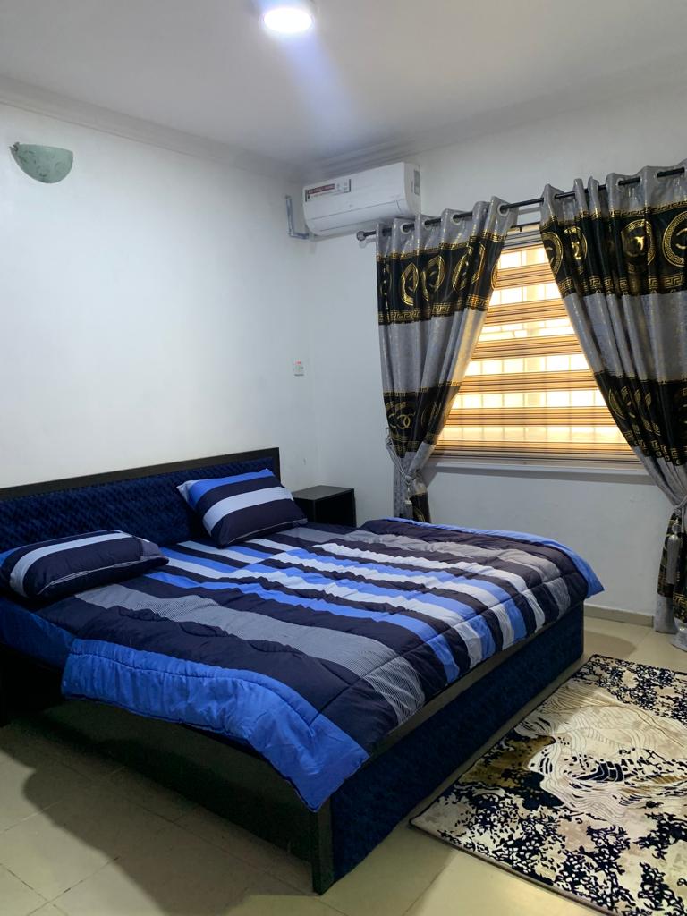 This lovely newly furnished 3 bedroom all ensuite apartment is located in a secure gated estate with 24-hour security at Ipaja Road, Lagos. The community is very peaceful and the atmosphere is calm. The apartment is fully furnished with a TV, DSTV, Air conditioning, and fan in the living room and bedrooms. The kitchen is fully equipped with modern appliances like a Pressure cooker, rice cooker, electric blender, toaster, kettle, lovely cookware, cutleries and all crockeries needed for cooking.