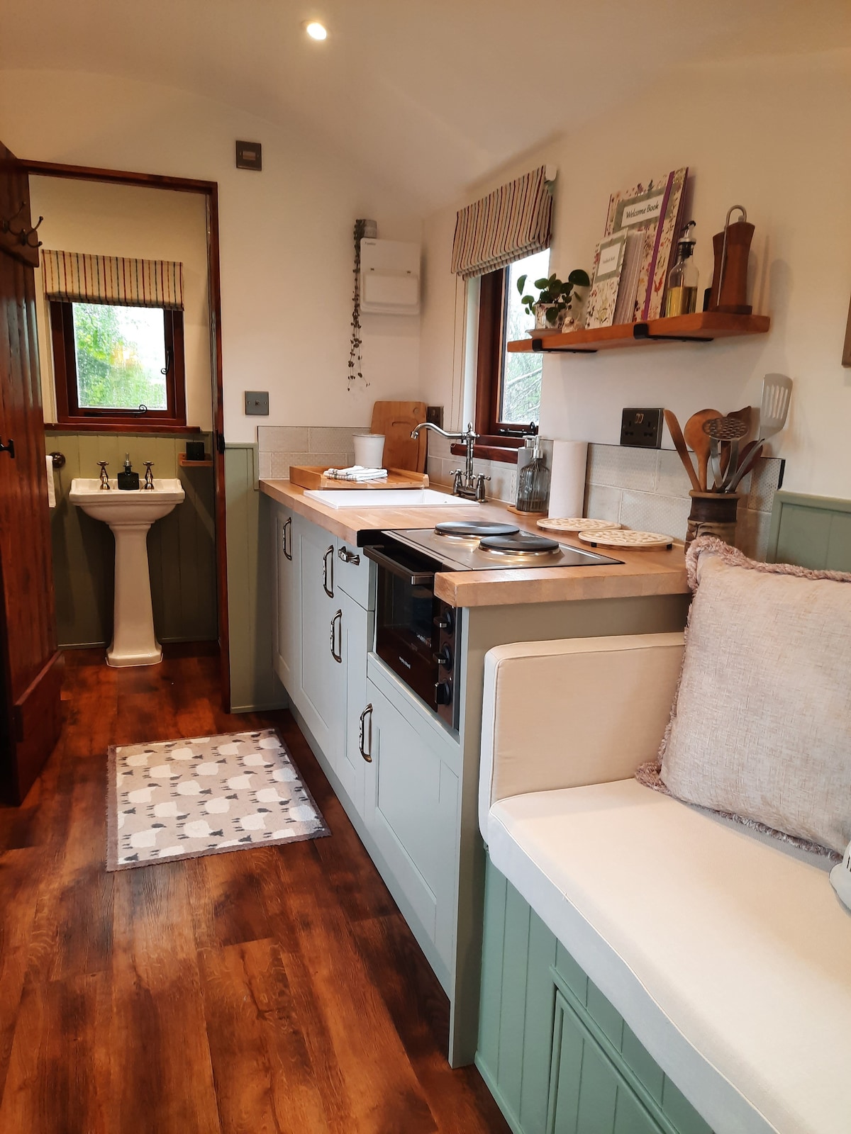 Perched over the Elham Valley, this romantic luxury shepherd’s hut offers sweeping views & total seclusion. Styled in timeless Farrow & Ball tones with Liberty fabrics, it features a plush duck down bed, log burner, soft waffle robes & slippers. Unwind in the hot tub under starry skies, wake to glowing sunrises & end with unforgettable sunsets. Surrounded by peaceful countryside & friendly Valais Blacknose sheep, goats and hens. Just moments walk from the award-winning Kings Arms gastropub.