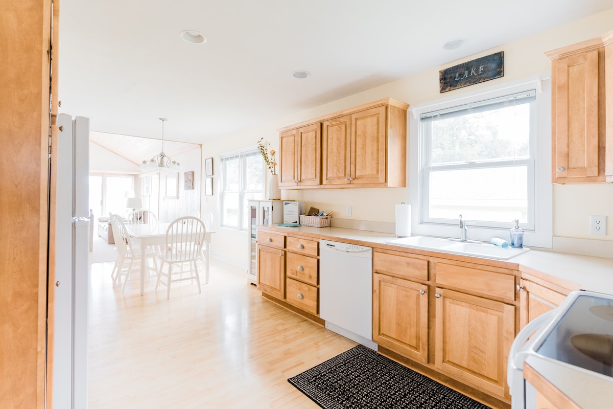 Two King beds and a bunk bed! Enjoy a couples or family get away with loved ones at this serene lakeside retreat. This 3-bedroom, 1.5-bathroom haven boasts modern comforts, a shared dock across the street and complimentary kayaks for endless lake adventures. Enjoy family meals on the spacious covered deck, soak in sunset views over Hutchins Lake, and toast marshmallows around the fire pit in the fenced backyard. With a peaceful dead-end street location, it's the perfect escape.