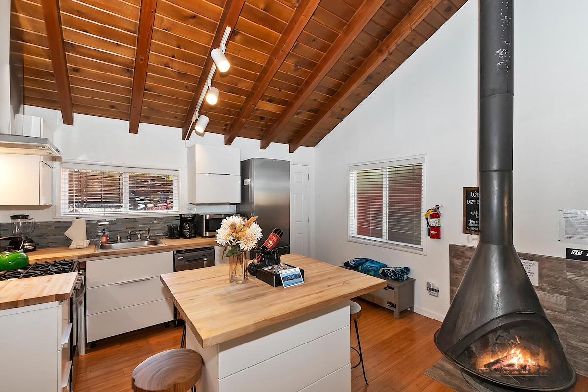 Come escape to our newly renovated 3 bed, 2 bath cabin with Central A/C & Heat, & located near the village, lake, alpine slide, ski resorts, & hiking trails. Our home includes many well thought out details & amenities-the perfect getaway for families, couples, or friends. High vaulted wood beam ceilings, wood burning fireplace, board games, vinyl record player & a fully stocked island kitchen. The cozy back deck is nestled under string lights, & home is equipped with a Level2 EV charger.
