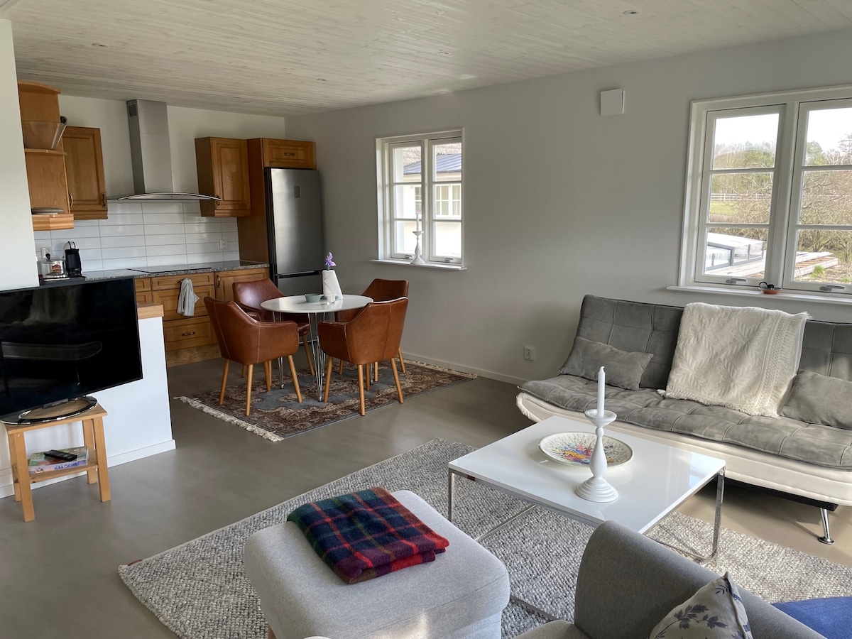 Relax with the family in this peaceful accommodation on scenic Järavallen. With horses in the pasture outside the door is this newly built apartment. Bedroom with double bed, living room with sofa bed and the possibility to make an extra bed. Fully-equipped kitchen with fridge, freezer, coffee machine, induction stovetop, microwave, etc. Bathroom with washing machine. The sea, swimming lake, cycling and hiking areas, paintball and high-altitude track within one kilometer. Barsebäck golf course is 5 minutes from the farm by car. Breakfast buns to order.