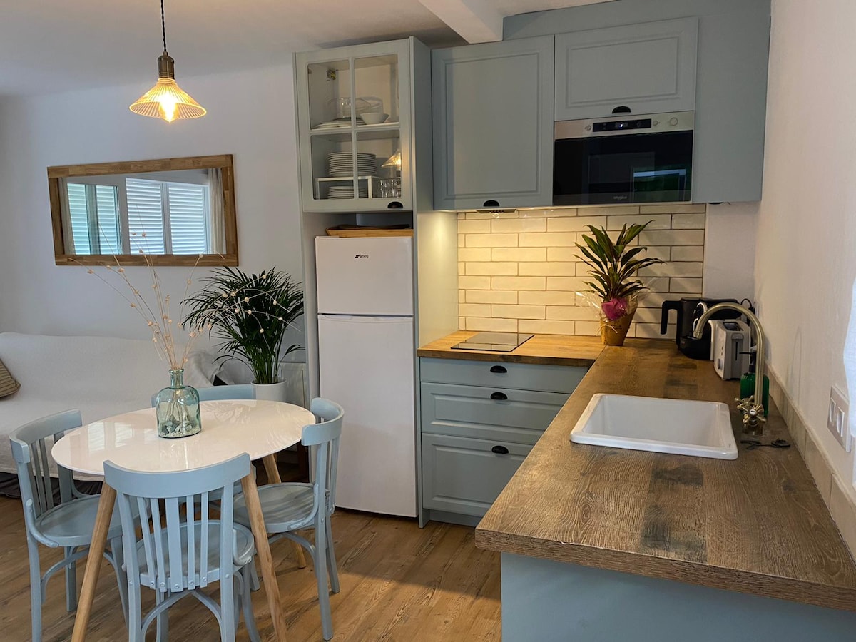 Small villa in a residence with pool in summer. It consists of a main room on the ground floor with a fitted kitchen and a small reception room, a bedroom with a double bed of 120 cm, a laundry room and a bathroom - toilet. Upstairs a living room with TV, sofa and desk for teleworking. The property has internet (livebox and TV), washing machine, dishwasher. Quiet, the accommodation has an exterior away from prying eyes with a south-facing view.