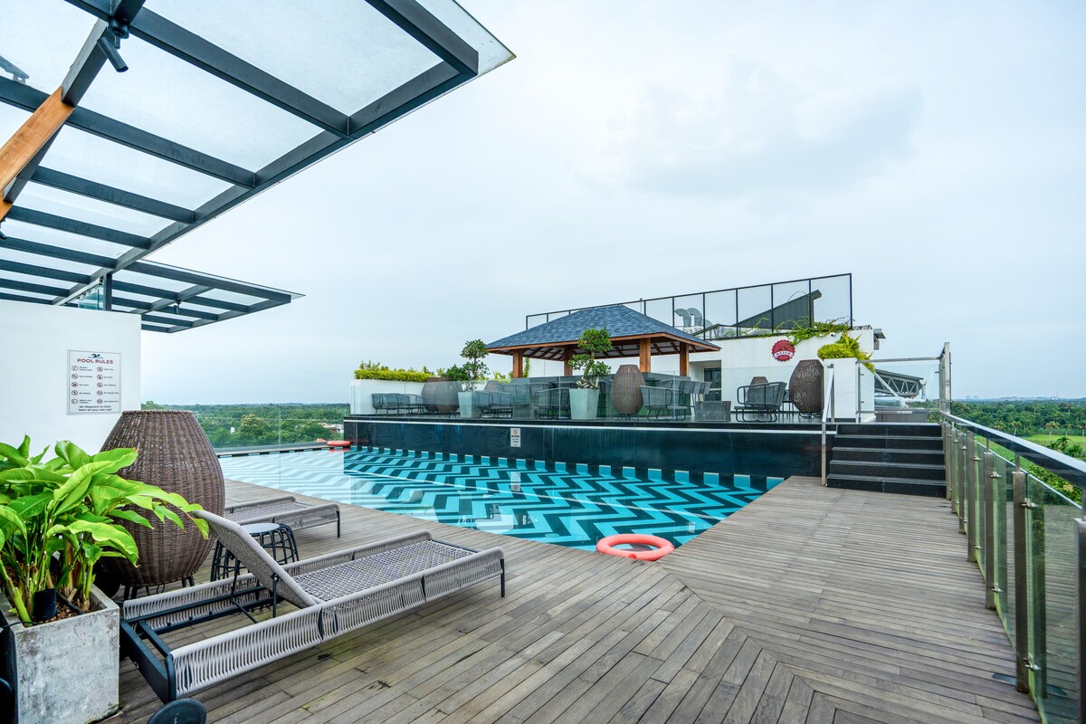 Touchdown by Nebz360 is a premium 2BR apartment just 3 mins from Cochin Intl. Airport. Enjoy a fully air-conditioned space with 2 king beds , 2 bathrooms, 2 balconies with automated lights, smart TV, fast Wi-Fi, and a kitchenette with beverage starter kit. Includes access to a rooftop pool (7 AM–7 PM), self check-in, free parking, elevator, and wheelchair access. Essentials provided. Close to metro and railway stations for easy travel. Smoking allowed only in balcony.