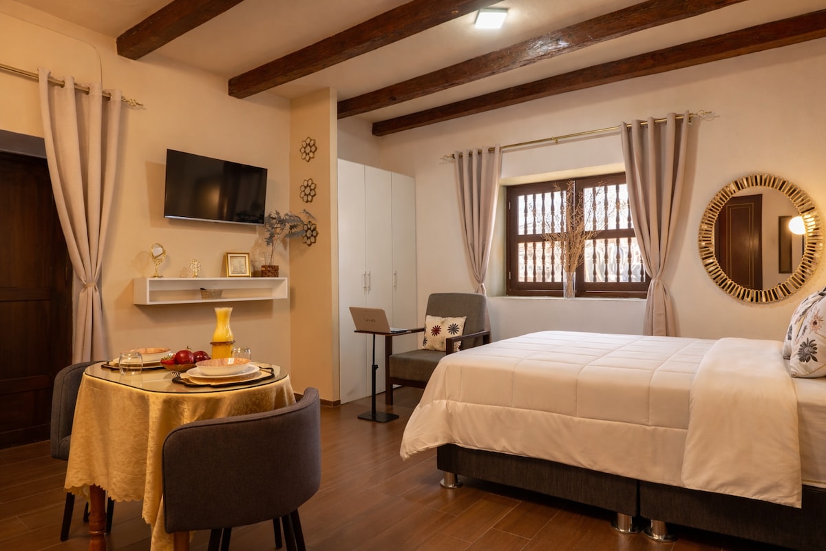 Disfruta de una experiencia con estilo en este alojamiento céntrico. Habitación en el primer piso, con diseño propio, cama Queen Size, baño, cocina y comedor privados, agua caliente, TV 55", Wi Fi, terracita. Tendrás también acceso a otra terraza y bar en el piso superior, con TV de 65" y vista a toda la ciudad.