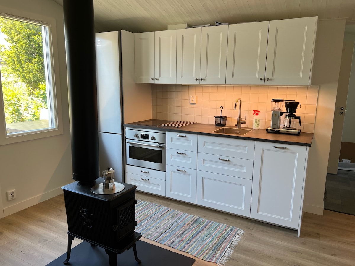 Nice cottage with all the comforts, located 120 meters from the sea in Torslanda. The cottage is about 40 sqm but feels larger as it has high ceilings and lots of light. Bedroom with sea view and exit to the south-facing terrace. The bedroom has a double bed of 180 cm. Open plan kitchen/living room. New fully-equipped kitchen with oven, induction stove, microwave, dishwasher, built-in fridge and freezer. Toilet with shower corner and floor heating. Private garden.
