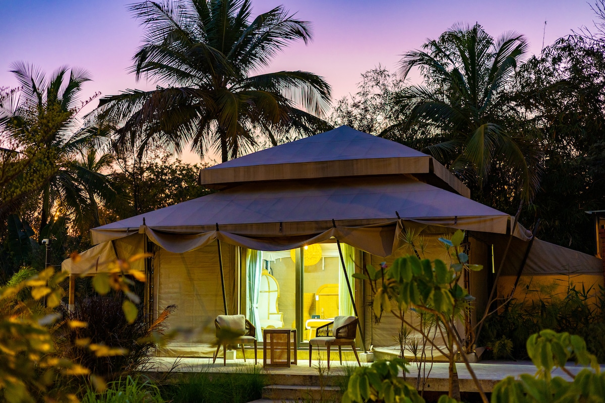 Set within 1-acre of lush tropical landscape, this estate features a fibre-tent with a bathtub & a private patio, where a raw-wood dining table & wicker seating sit beneath a layered canopy roof.Guests can unwind by the Moroccan-inspired shared pool, framed by tall palms & loungers, relax in the tranquil garden dotted with sculptural accents, or gather in the charming thatched.evening falls, the sunken firepit offers a cosy, intimate space to connect under the stars amid the nautre .