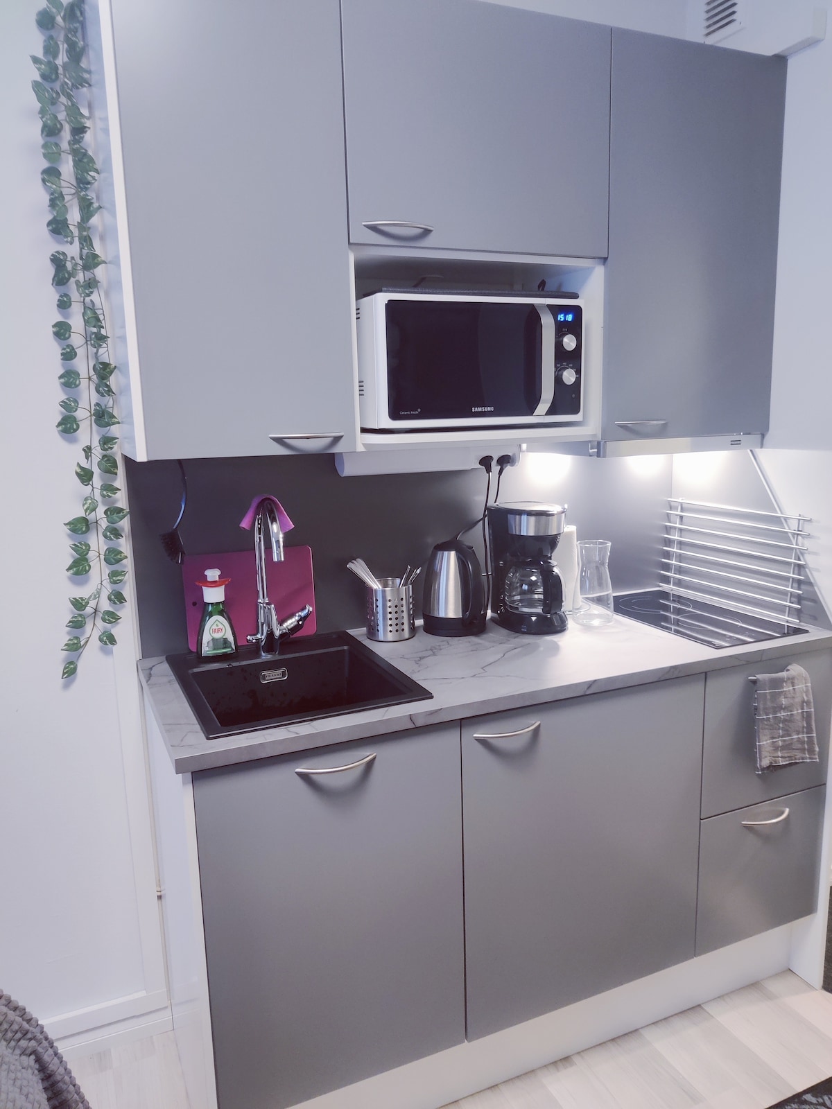 A romantic getaway or relaxing with a friend. An idyllic "cottage suite" in Kouvola on the shores of Lake Rapojärvi. Kitchenette (stove, coffee maker, kettle, microwave), double bed, baby cot available on request, dining table, TV with chrome cast, internet, toilet, shower, dressing room and wood sauna. Outside, a wood grill with equipment. Large glazed terrace with radiator. The price includes linen, towels, wood, paddleboards and a rowboat. The tap water is potable and warm.