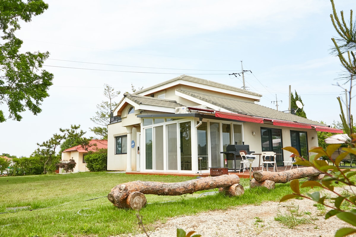 1. It is located across the Yeonyuk Bridge in Anmyeon-do. Baeksajang Port and Beach (Sambong, Baeksajang, Flower Bridge) are not far away. 2. The accommodation is a private house, so there is no common space. Living room: sofa, dining table. Bedroom: king size bed. Vanity Terrace: outdoor table, barbecue grill. After confirming your reservation, we'll send you a message about where to go to Anmyeon-do and where to shop. If you have any additional questions, please feel free to leave a message. We'll get back to you within an hour. Facility: TV, refrigerator, sink, air conditioner, dressing table, range, cooking utensils and tableware, microwave, outdoor table, barbecue grill, Wi-Fi, dryer, shampoo, body wash, treatment, towel, toothpaste, etc. *Swimming pool is open only during the season (July to early September)