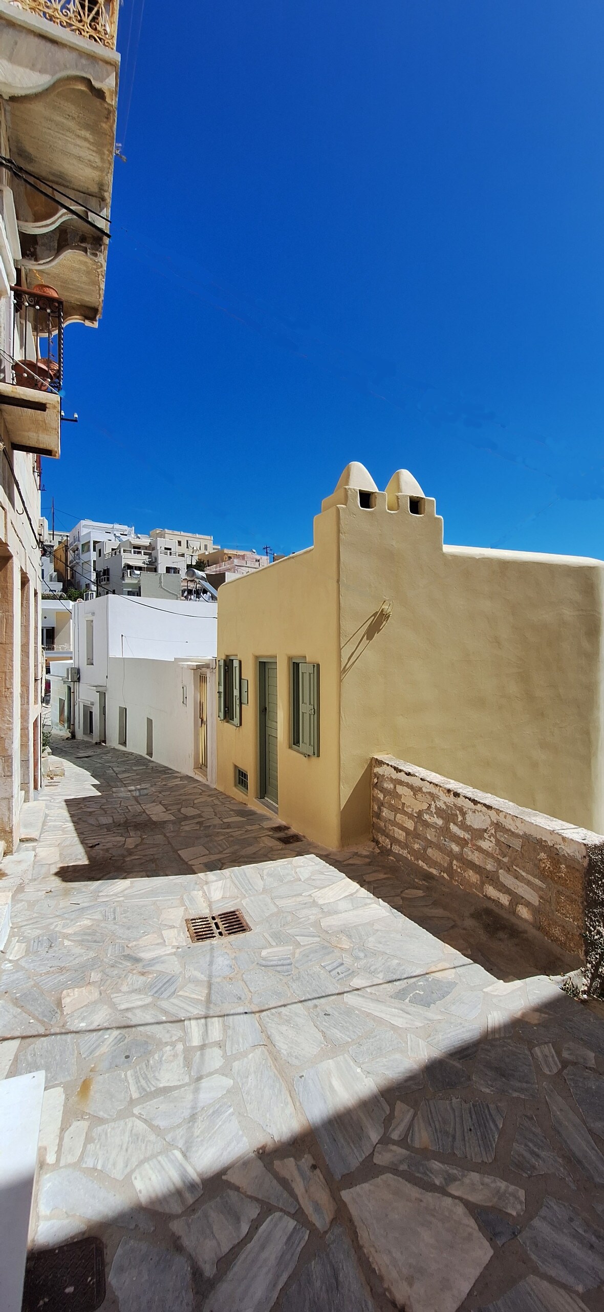 This place has a style of its own. Located in the center of the medieval settlement of Ano Syros. The house has a private upper terrace ( reachable by the ladder ) with the stunning sea view of Ermoupoli with its port/shipyard. There is a private outdoor dining area , sunny all day long . Many restaurants , caffès and stores are just around the corner. The nearest parking lot is 4 min by foot. Don’t forget the stairs of Ano Syros , there are many !
