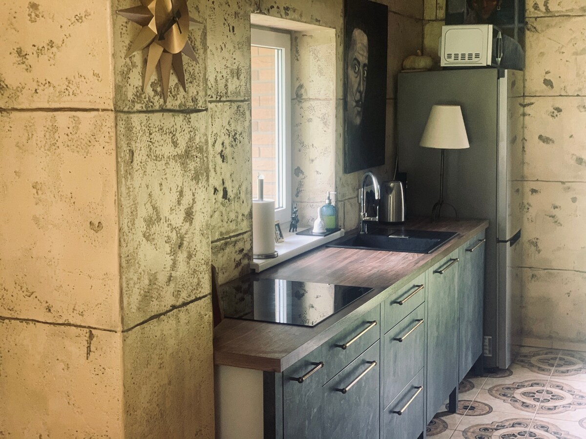 Have fun in this stylish place. For couples, families. There is a river flowing right next to it, there is a great access with a sandy shore for swimming or a quiet sitting. Along the house - bicycle and pedestrian paths. They will quickly reach both the forest and the city center with cafes and shops. You can have dinner outside, cook food on the grill. We accept children. We are flexible to your suggestions and wishes. Late check-in is possible. There is a code key box. The bus station is just outside
