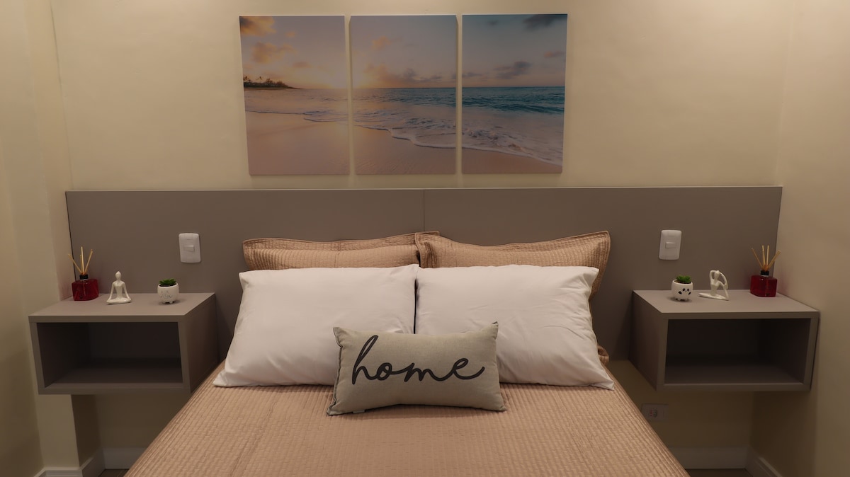 A newly renovated and decorated apartment combining different elements from the most diverse beaches in the world, located in the heart of Gonzaga, next to Miramar shopping mall. Close to several leisure options (3 malls, cinemas, restaurants and shops) and located less than 200 meters from the beach, you definitely won't waste time stuck in traffic! Equipped with a television, stove, refrigerator, microwave, coffee maker and washing machine, it is ideal for you to make the most of it with practicality.