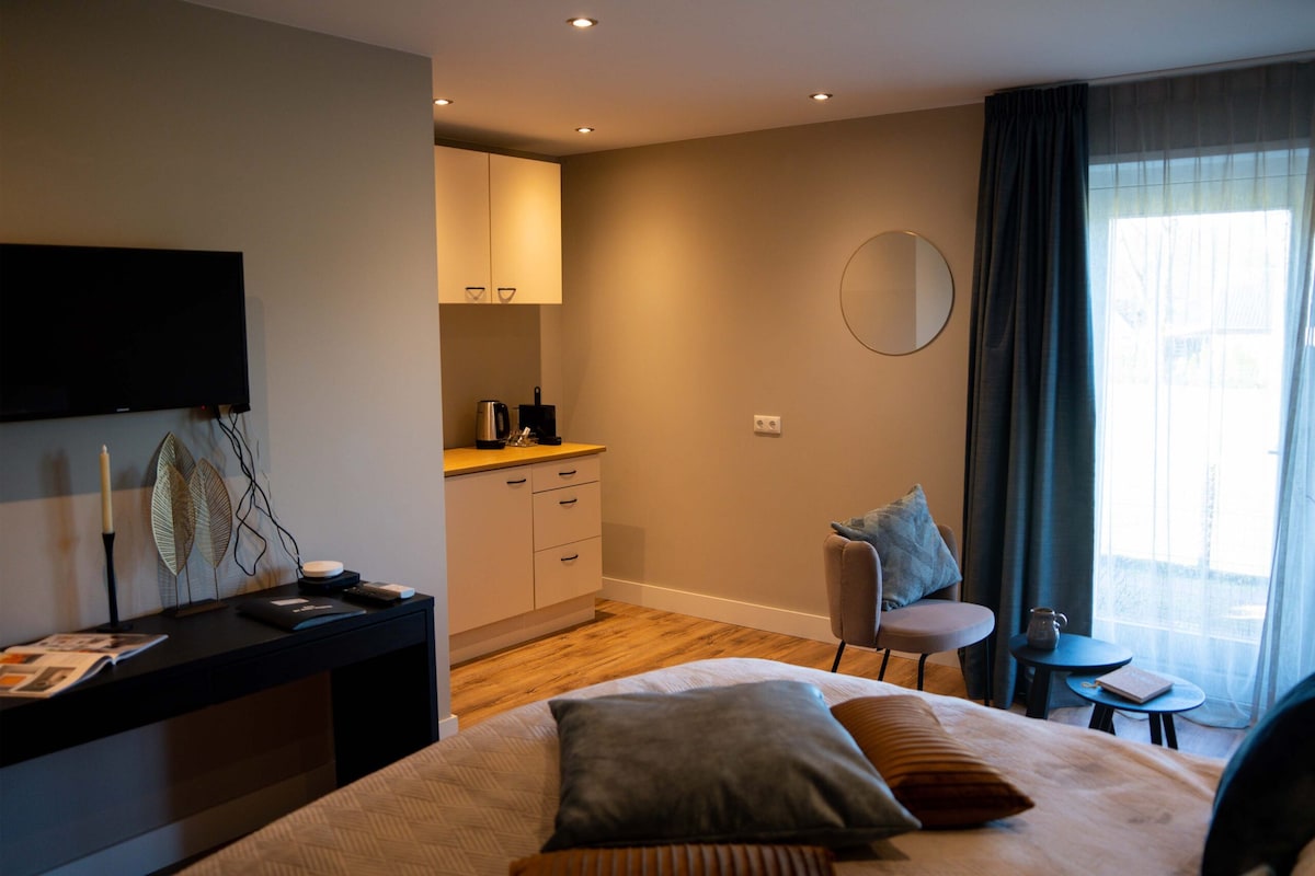 Beautiful authentic property built in 1895 in the center of Apeldoorn. Shops, restaurants, market and the station are all within walking distance. The fully furnished studio has a sleeping and living area and a luxurious bathroom with rain shower and bathtub. The sleeping area has a double bed (180x200), which can easily be made into two single beds. The living area has a separate dining area in the conservatory next to a cozy sitting area.