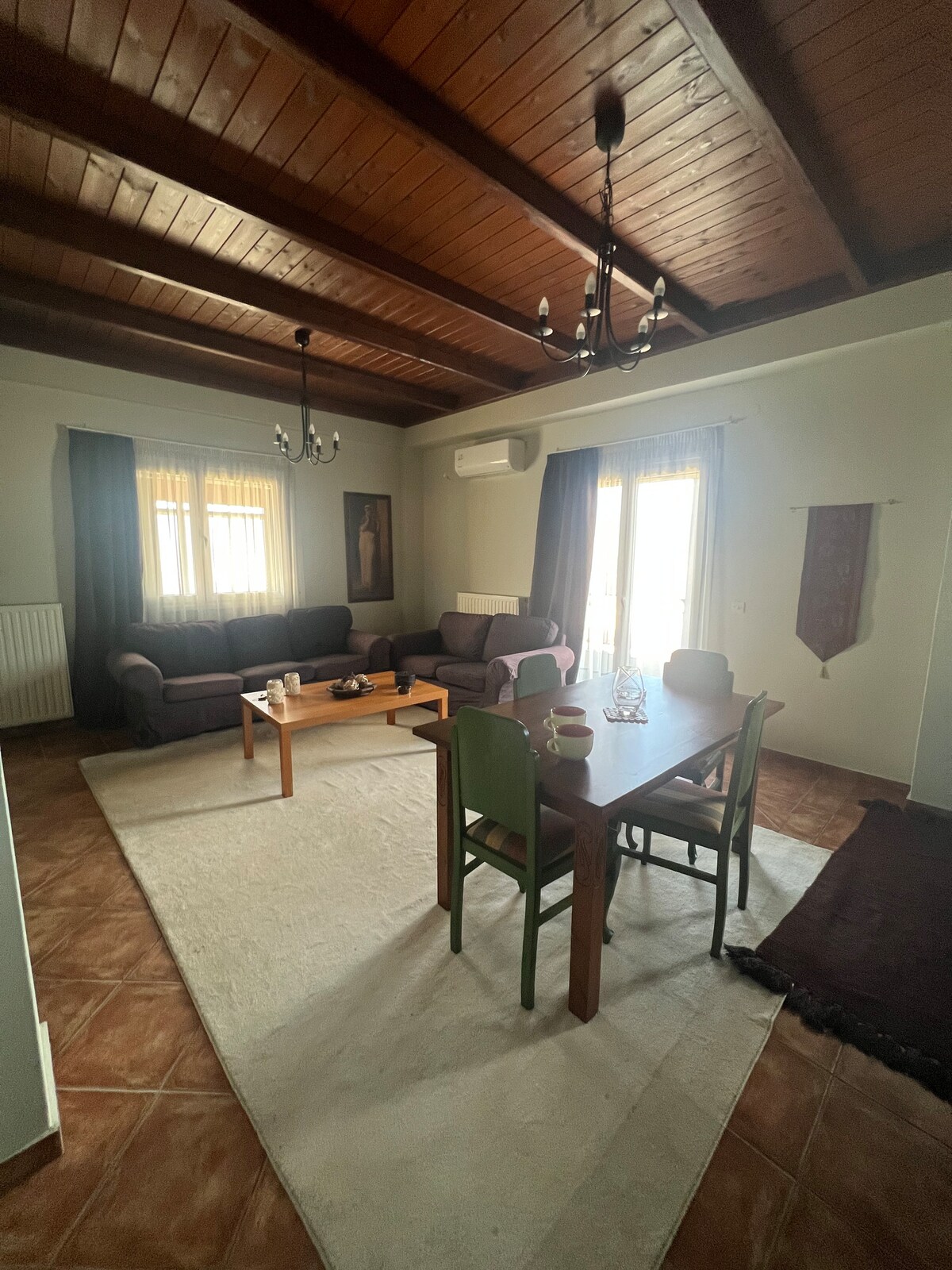Our villa is spacious & well equipped with one master bedroom , three additional bedrooms, plus a beautiful garret & with two bathrooms. Stone is harmonically combined with wood & classical style while two fireplaces will add a warm feeling to your nights. Every single spot inside the house is a window for the most breathtaking view of the mountain. You will sleep by the burble sound of the rippling flow stream as it travels along the crossing river just outside the house. Pure magic ...