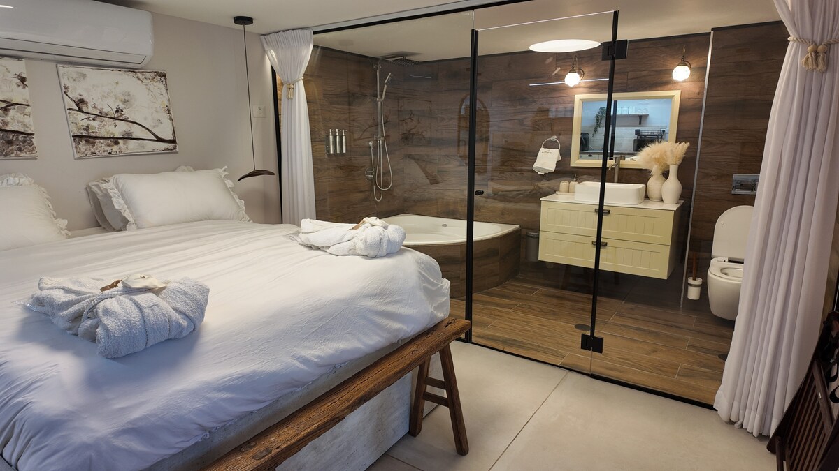 The Wadi Edge - Romantic Suite Escape to a stylish boutique suite on the desert’s edge. Enjoy a front-row seat to Yeruham’s ridge and stunning vineyards. The highlight: A private outdoor Jacuzzi under the stars, facing breathtaking sunsets. Features a designer double shower, a plush king bed (split option), a full kitchen, and a huge screen. underfloor heating, AC , ceiling fans Perfectly located near hiking trails, hidden pools, and desert blooms. No extra fees!